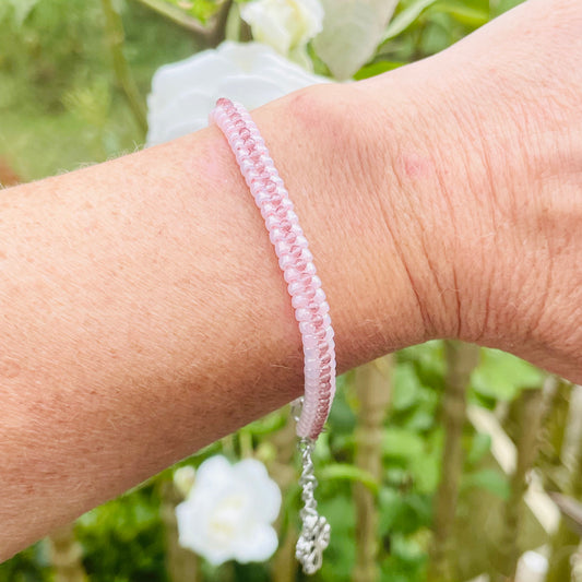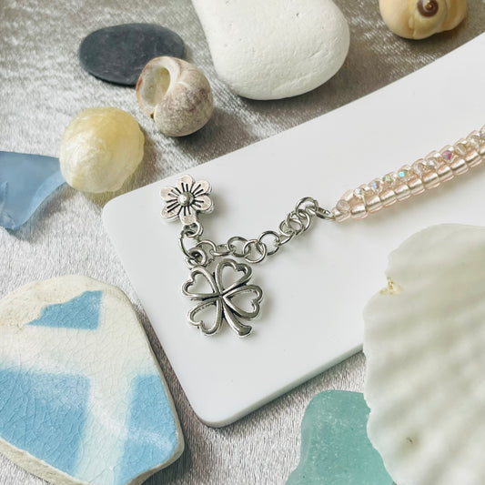 Crystal and glass beaded bracelet with Daisy and Clover charms (Baby Pink and Amethyst)