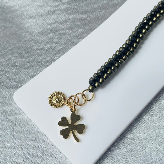 Crystal and glass beaded bracelet with Daisy and Clover charms (Bronze and black)