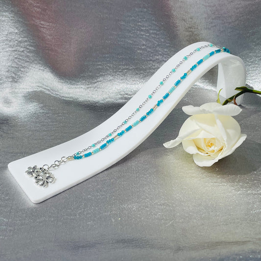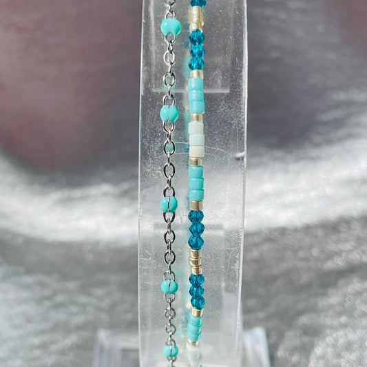 Double layer glass and crystal bead and chain bracelet (Turquoise and Pale Blue)